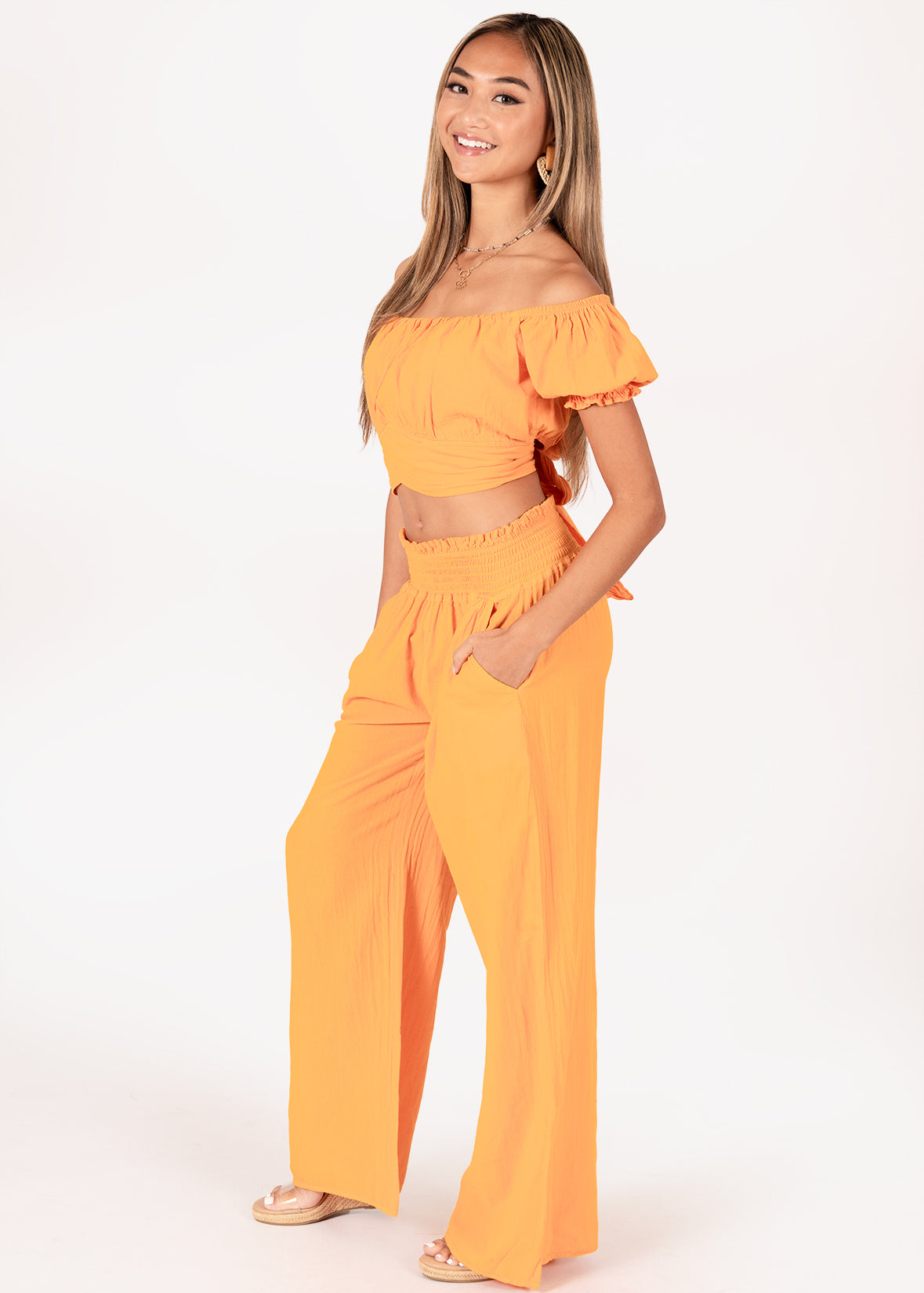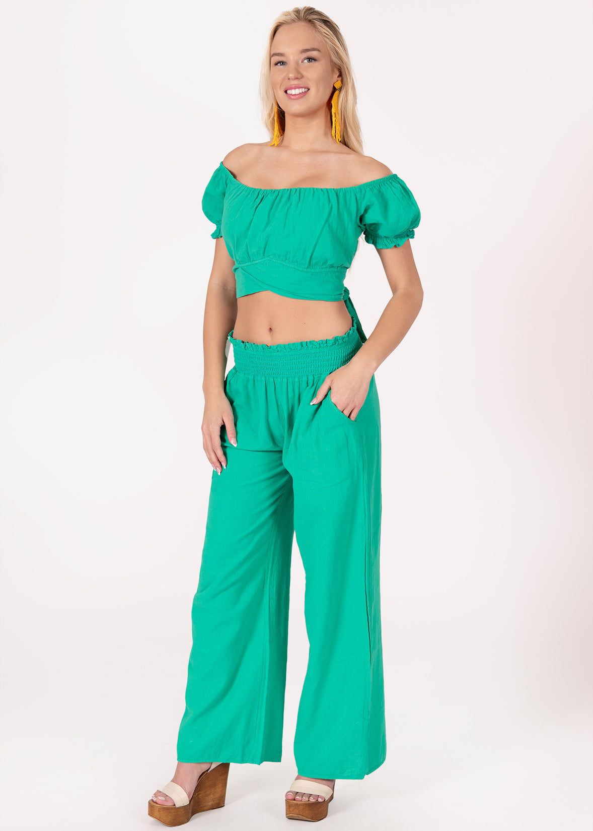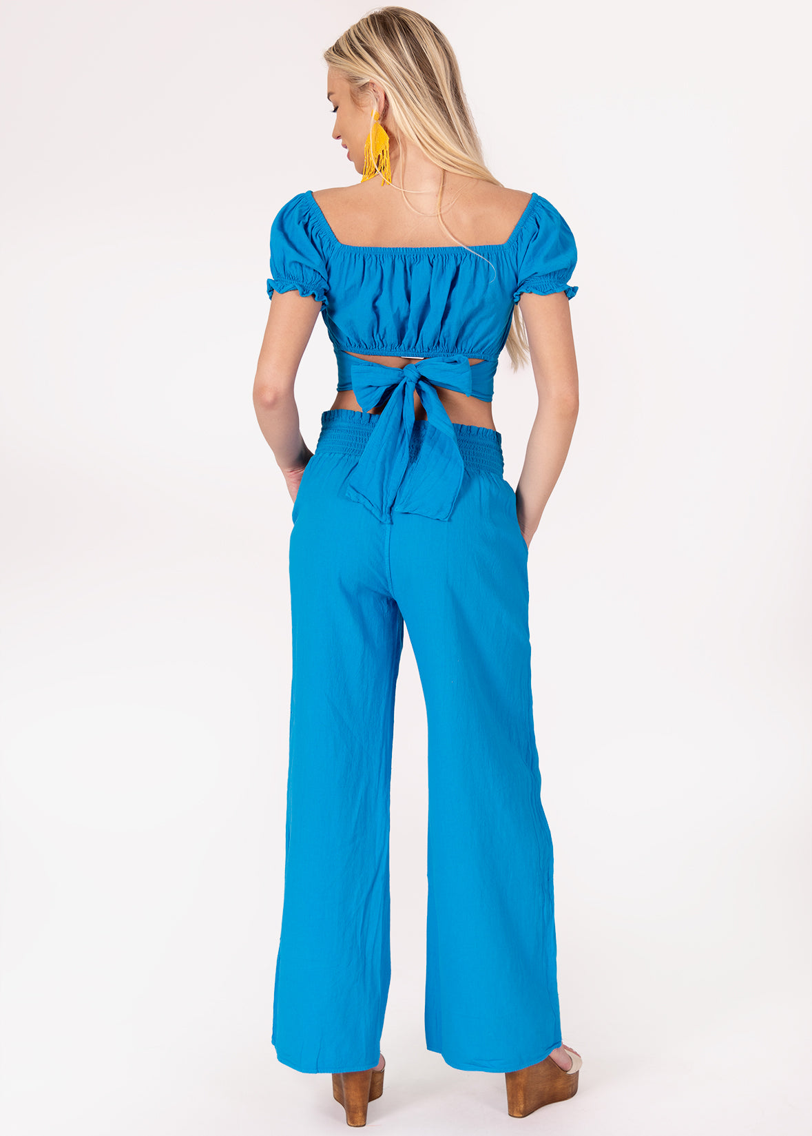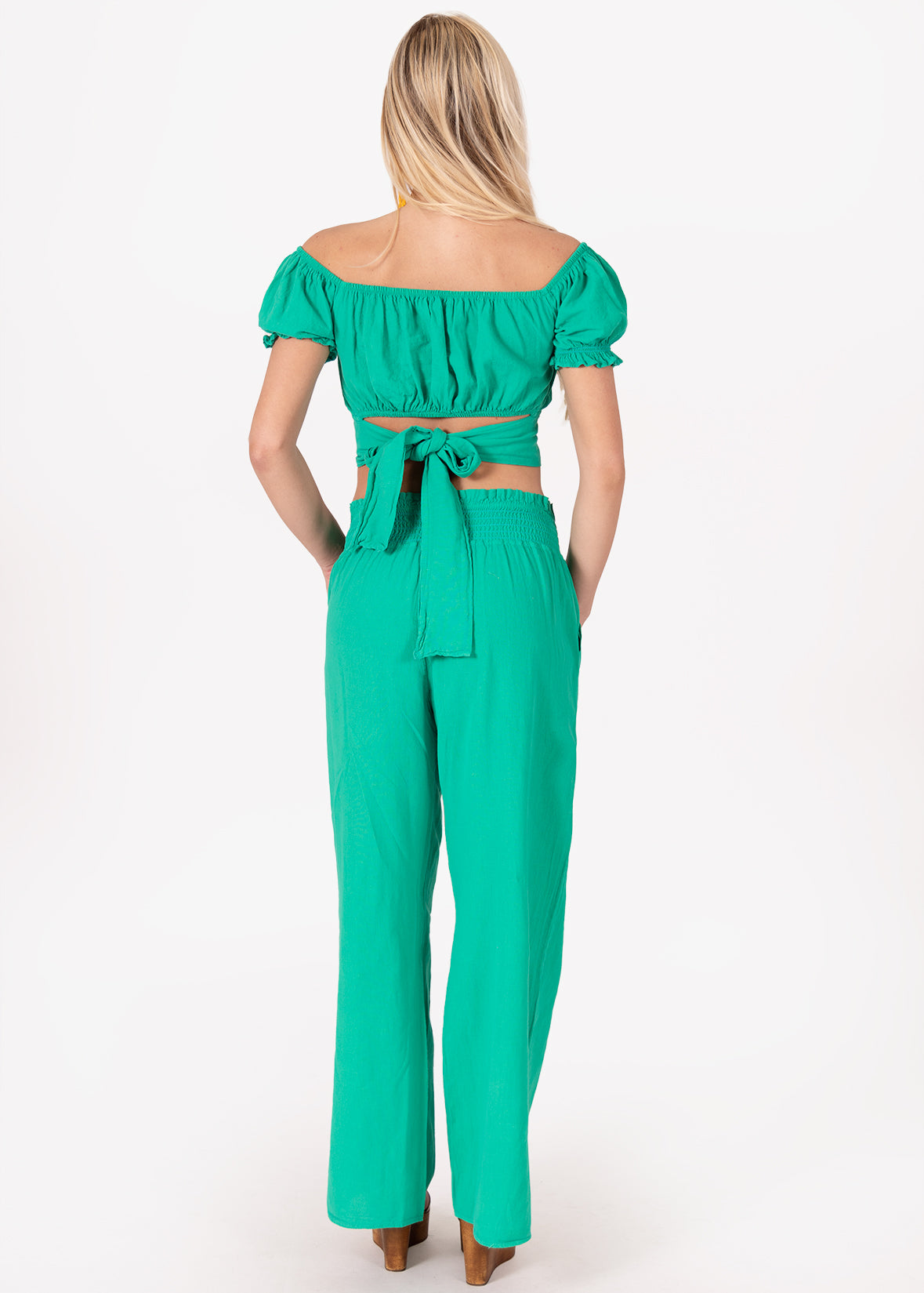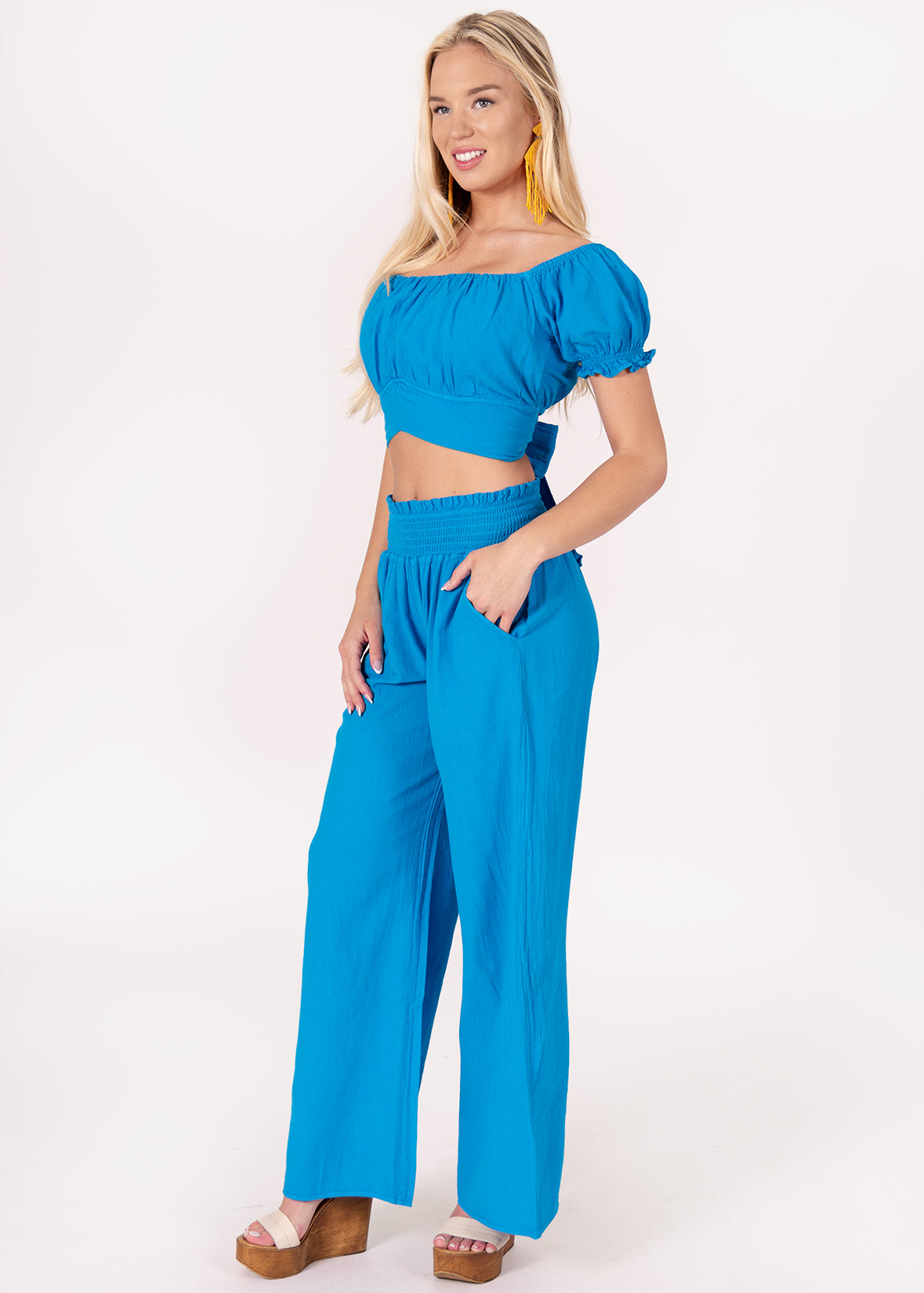 Say hello to sunny days with the 'Sabrina' Off Shoulder Top, equal parts playful and polished. This cropped silhouette features a flattering square neckline, puffed sleeves, and a twist-front detail for a feminine finish. The elasticized neckline allows you to wear it on or off the shoulder, while the tie-back ensures an adjustable, secure fit. Whether paired with matching wide-leg pants or worn with a breezy skirt, the ‘Sabrina’ is your go-to top for versatile, resort-ready style.