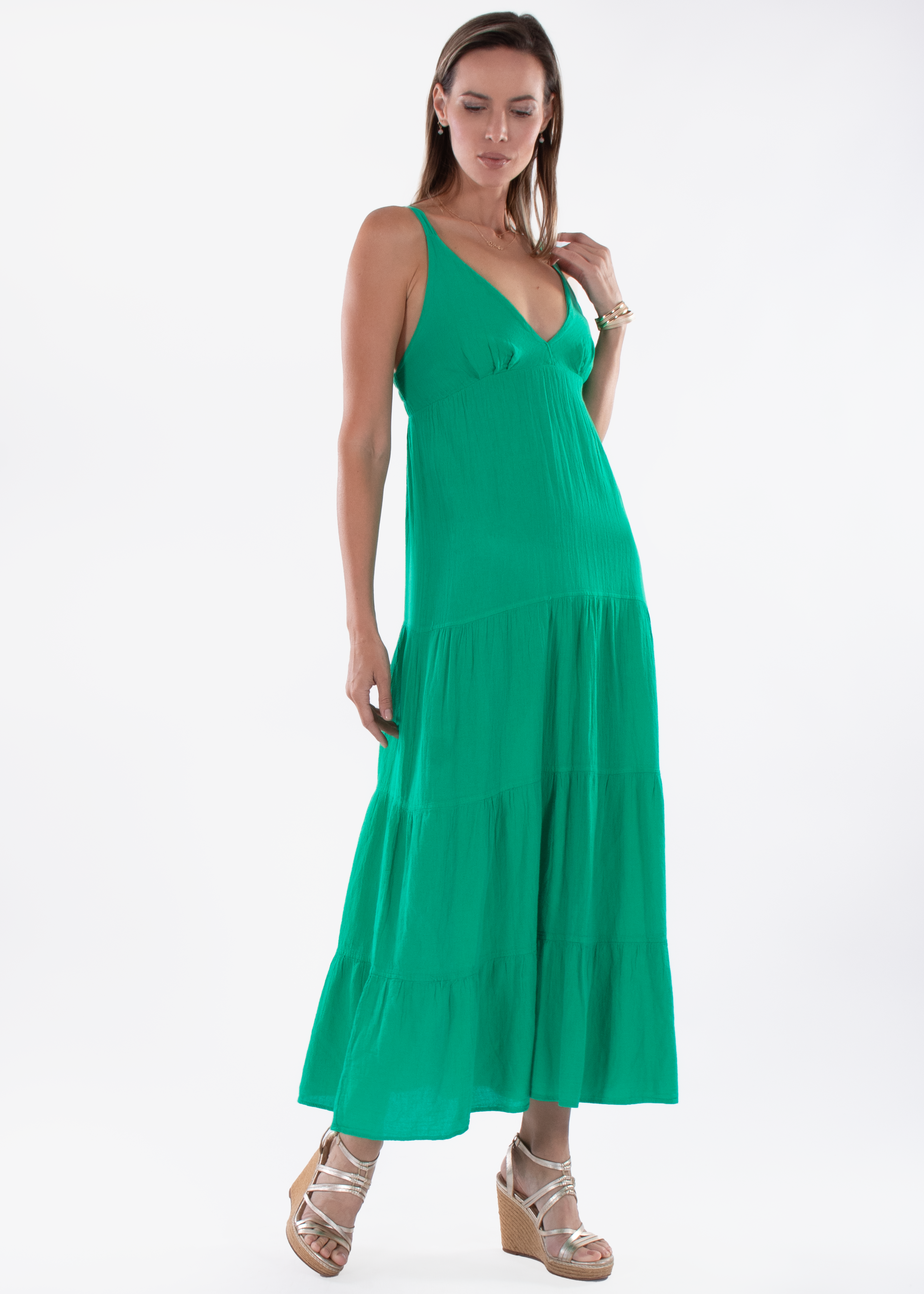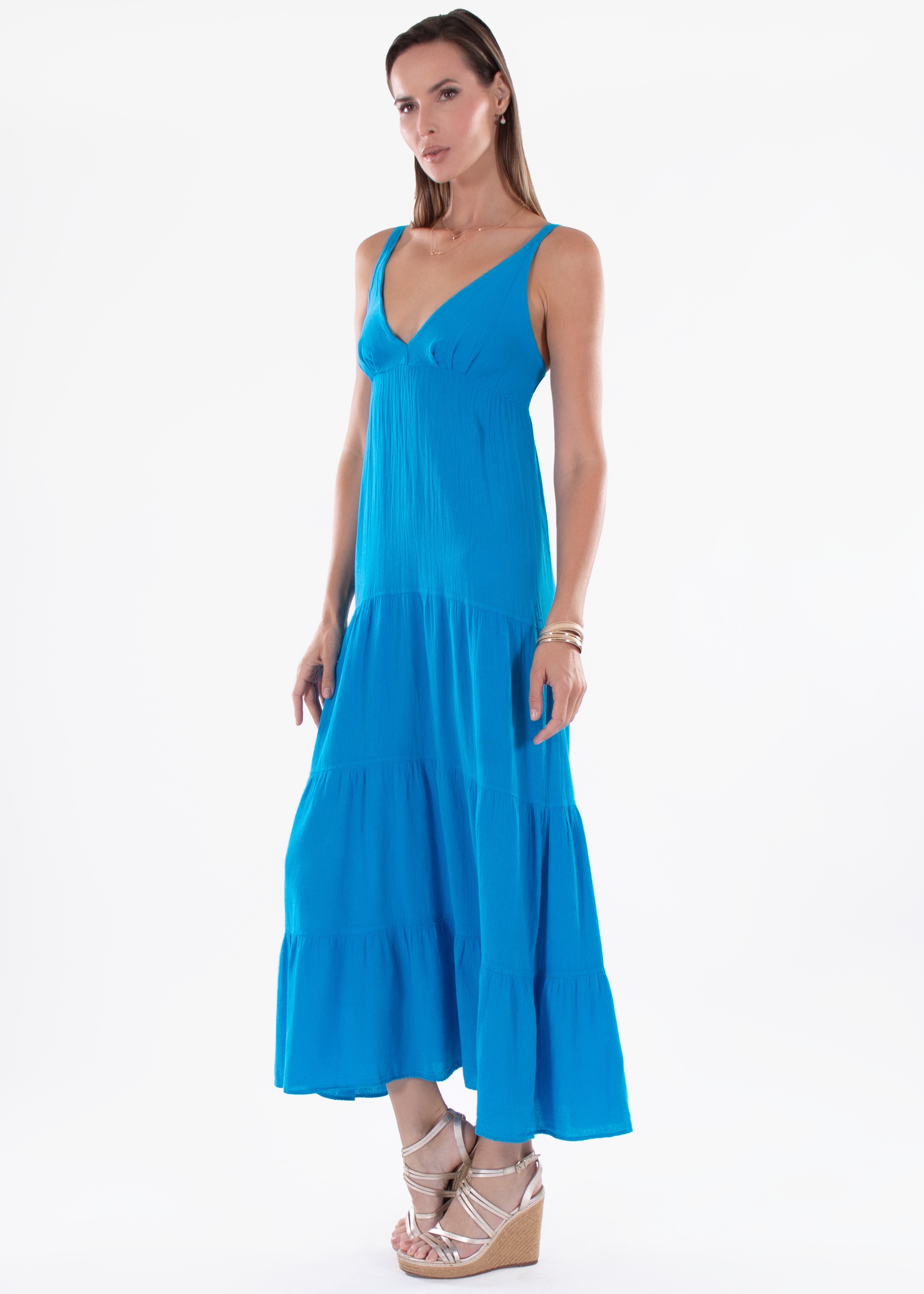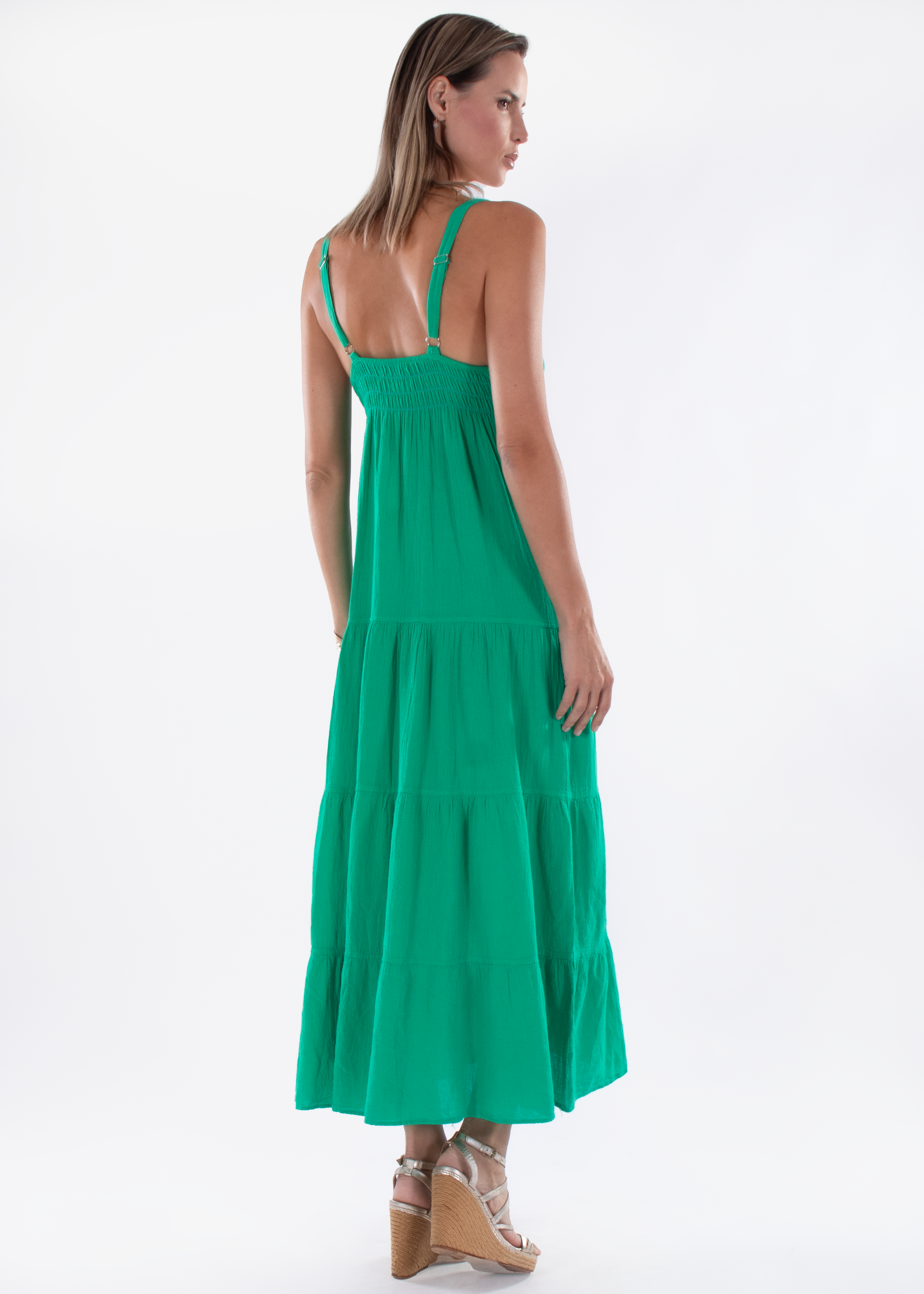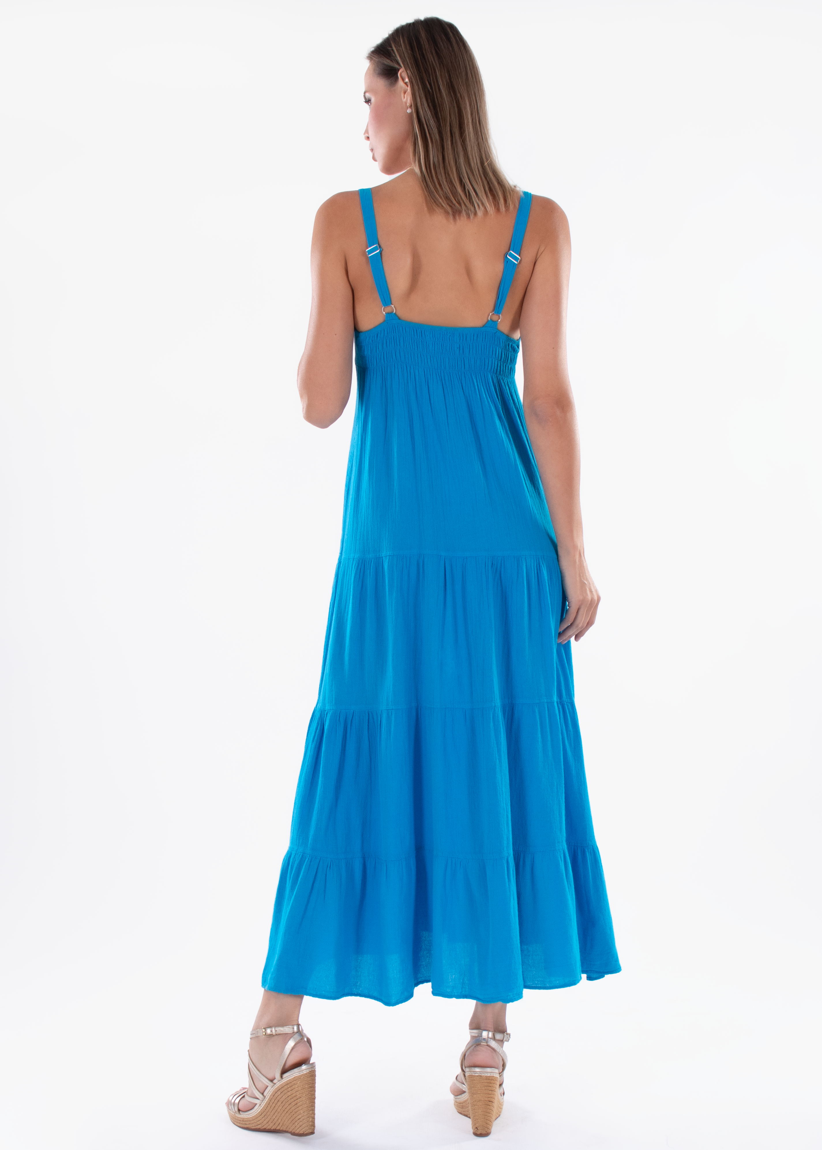 A timeless resort essential you’ll reach for again and again. This full-length cotton dress features a flattering deep V-neckline, adjustable shoulder straps, and a soft empire waist that flows into a tiered, breezy skirt. The smocked back ensures a comfortable, flexible fit, while the lightweight cotton fabric keeps you cool and free to move from the beach to dinner with ease.