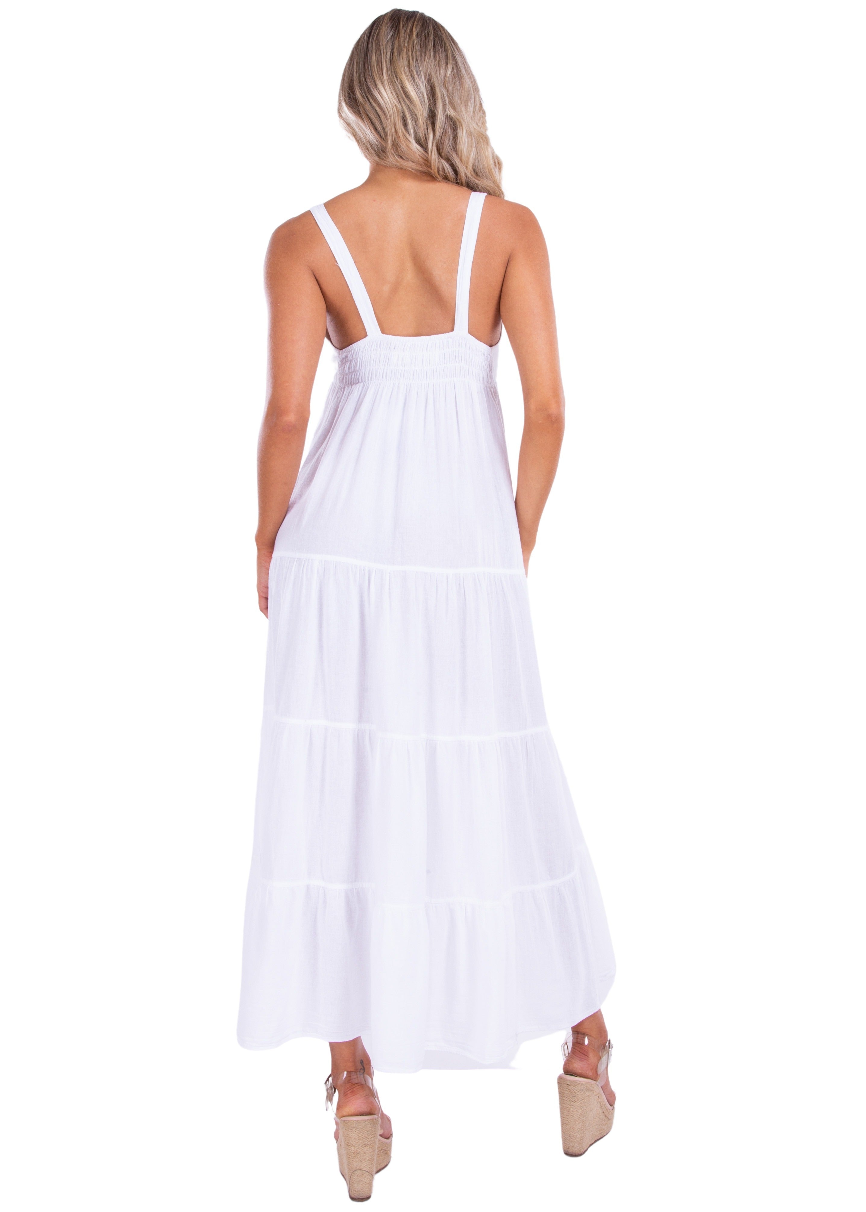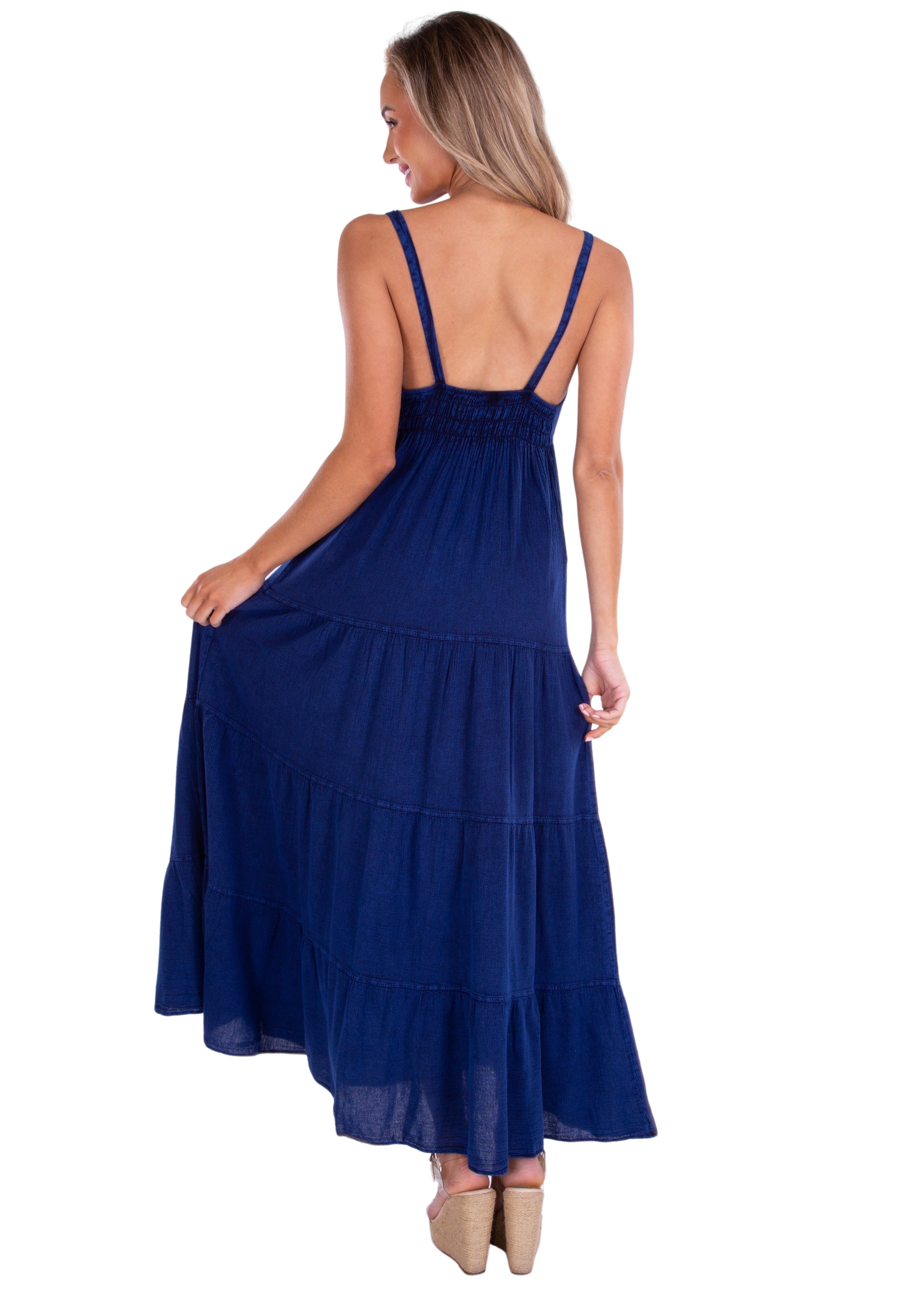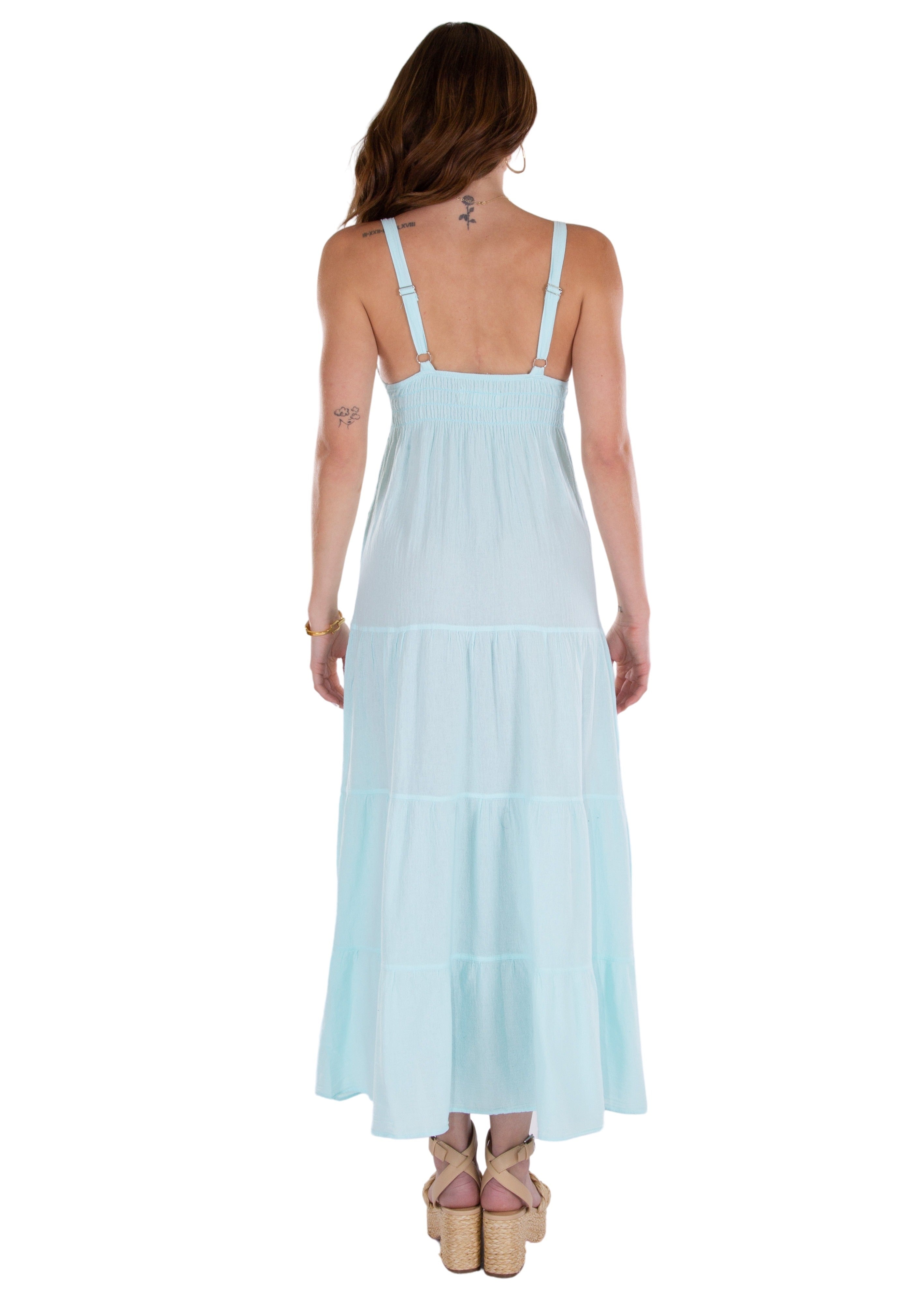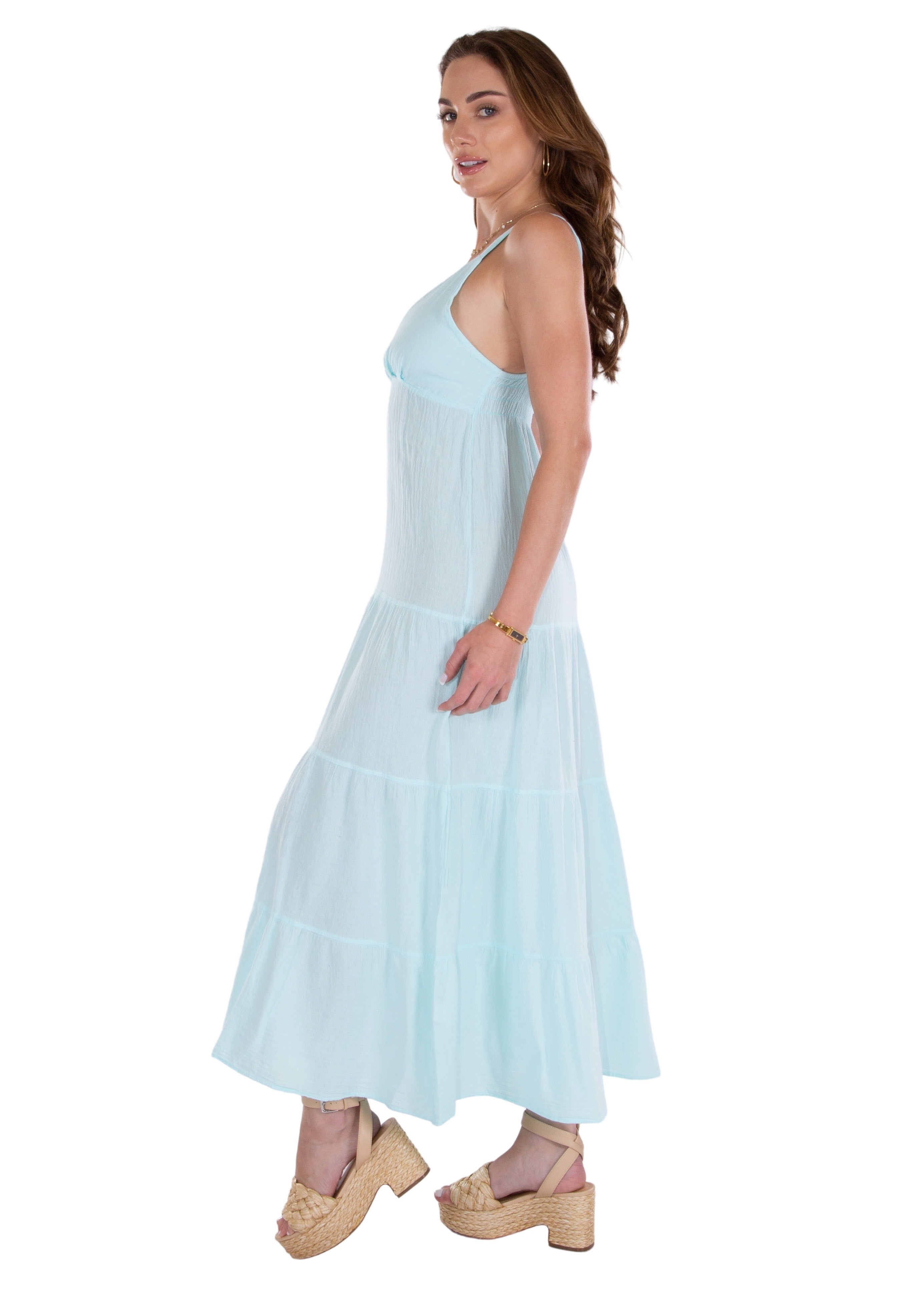 A timeless resort essential you’ll reach for again and again. This full-length cotton dress features a flattering deep V-neckline, adjustable shoulder straps, and a soft empire waist that flows into a tiered, breezy skirt. The smocked back ensures a comfortable, flexible fit, while the lightweight cotton fabric keeps you cool and free to move from the beach to dinner with ease.