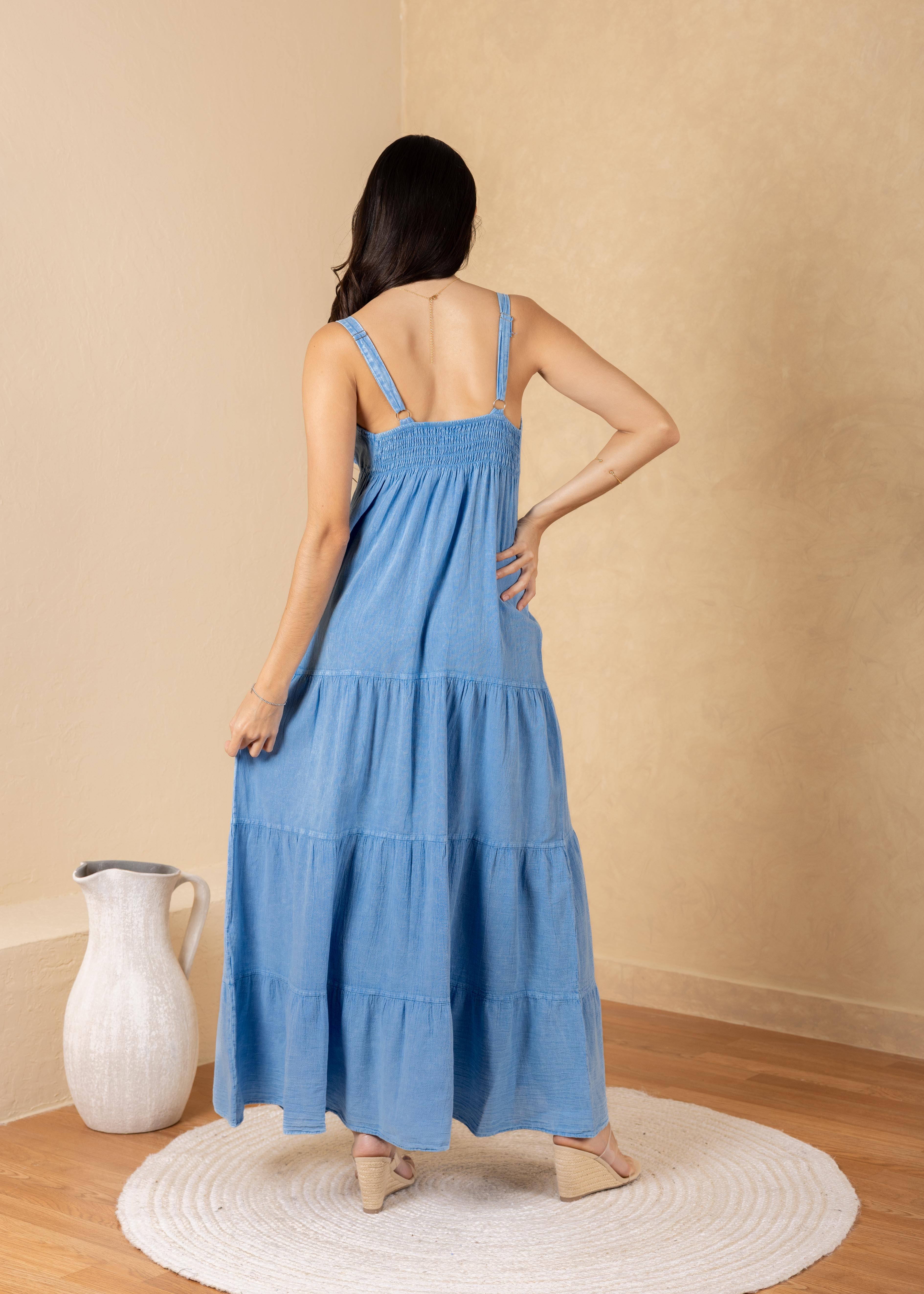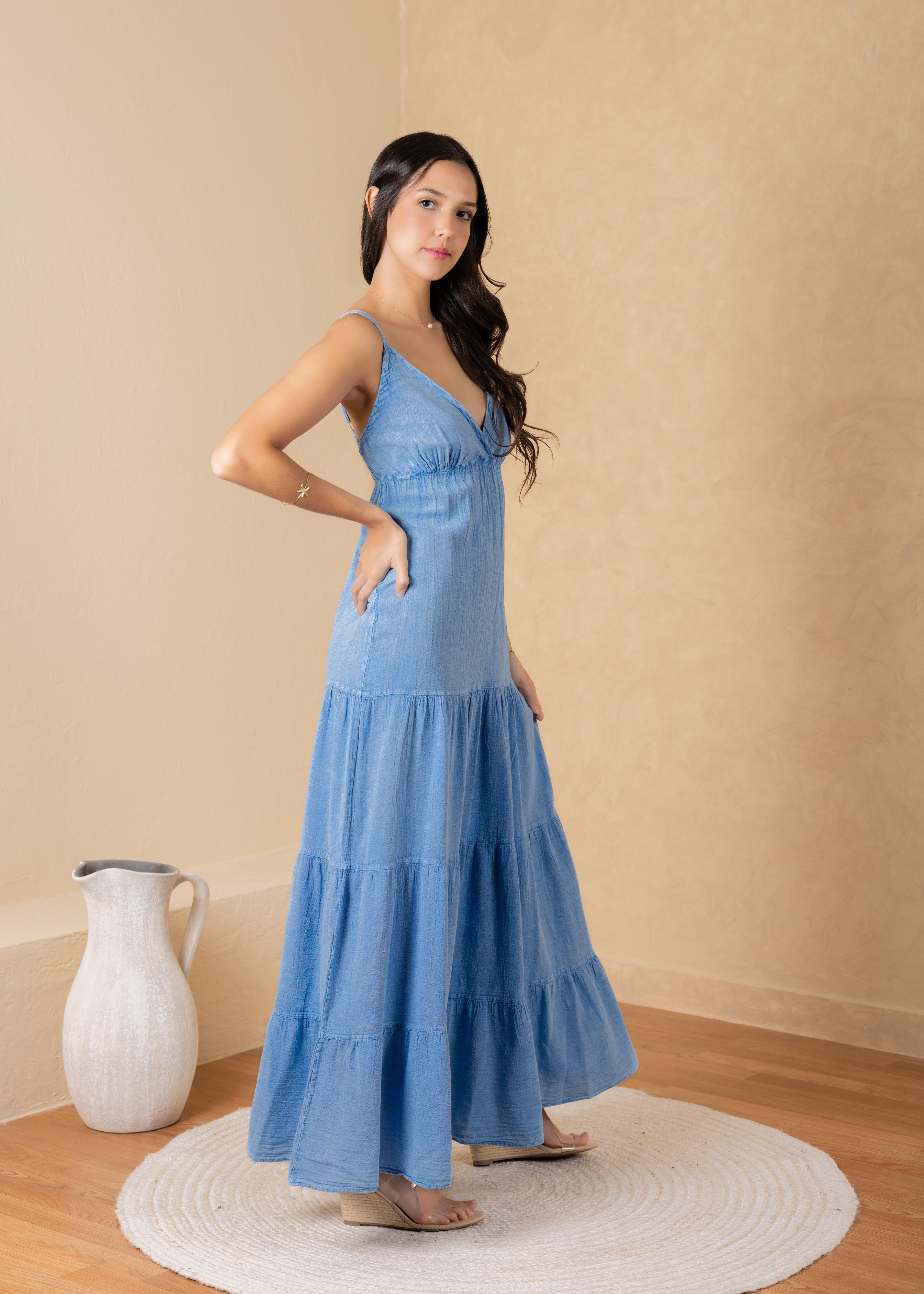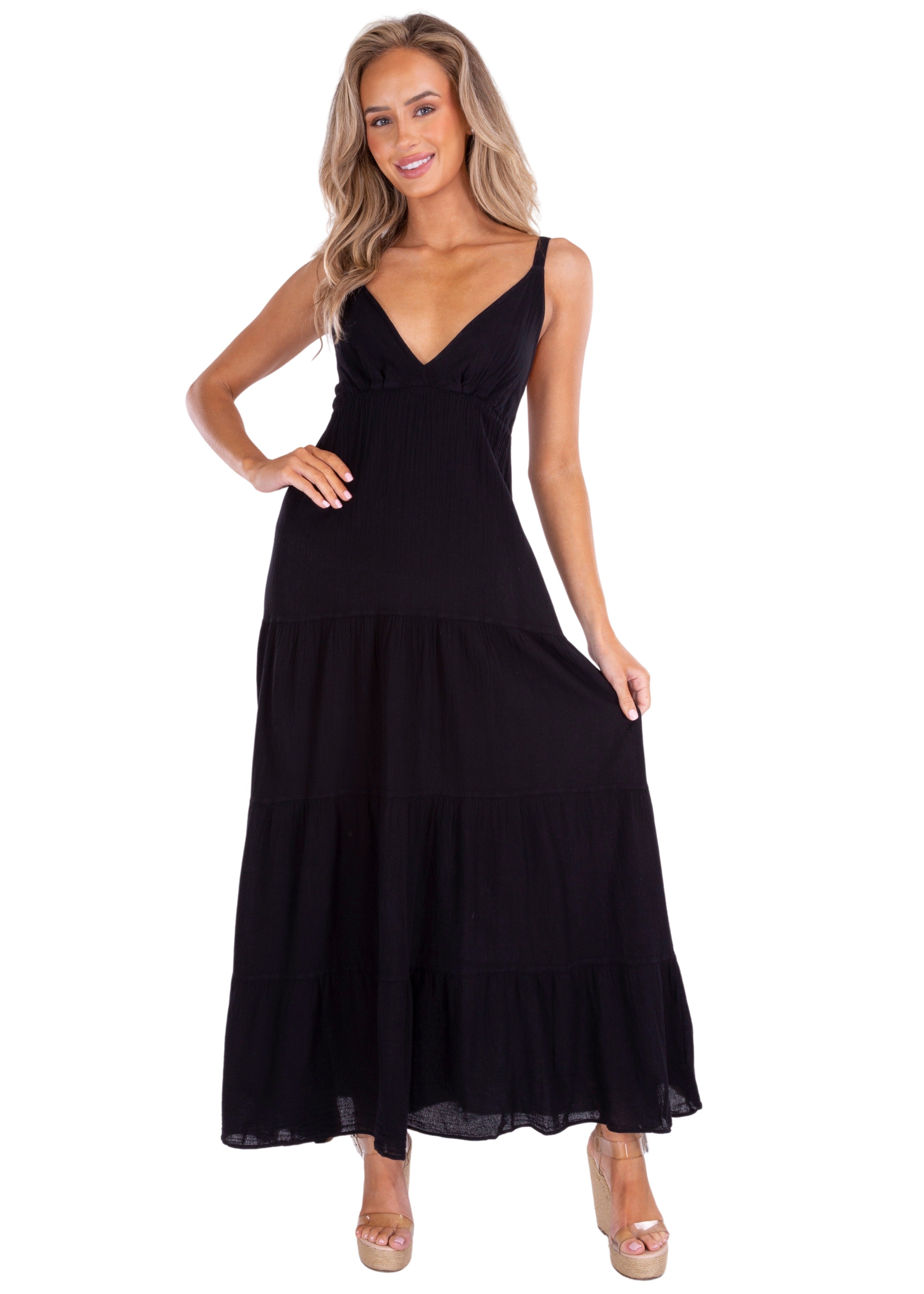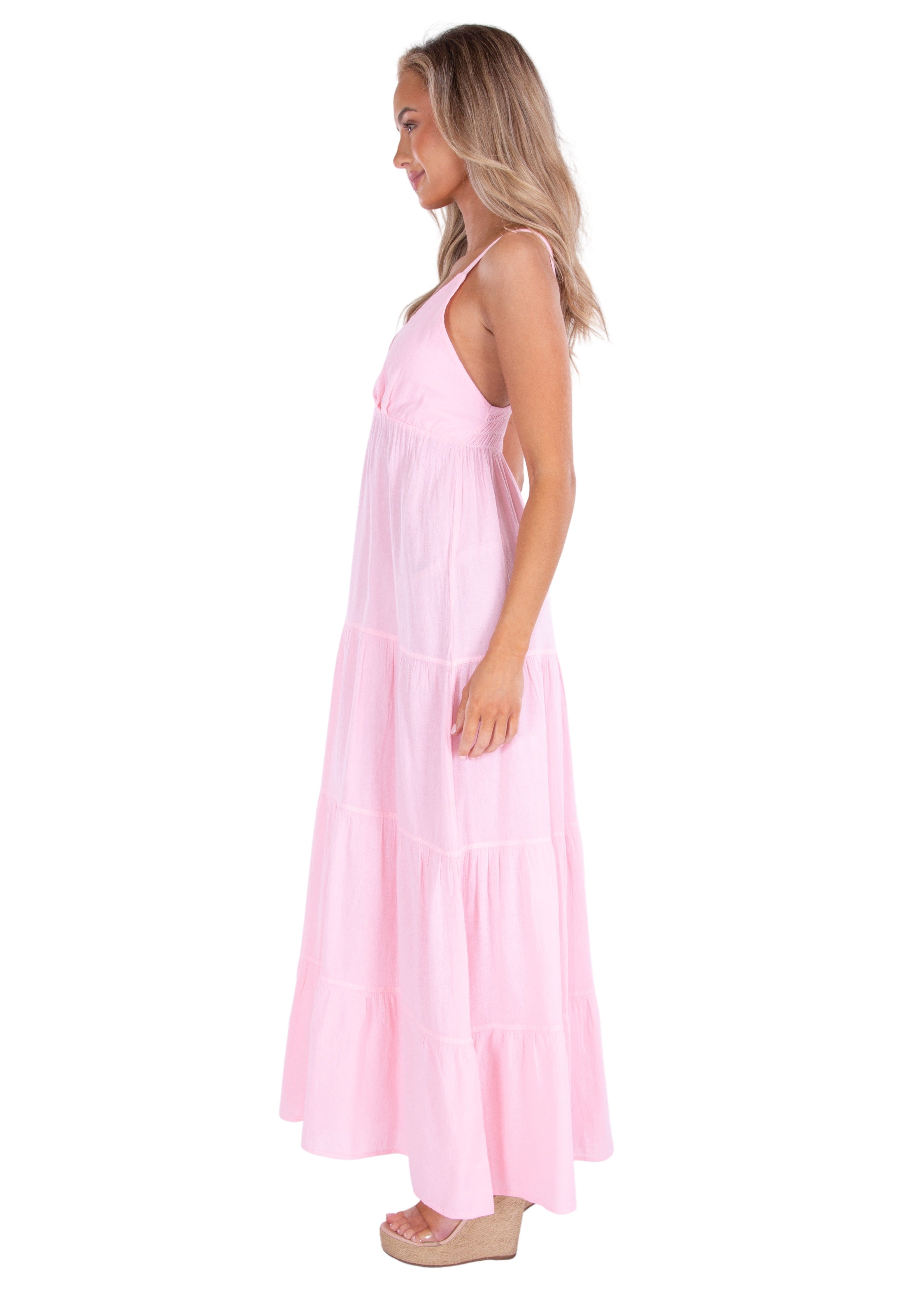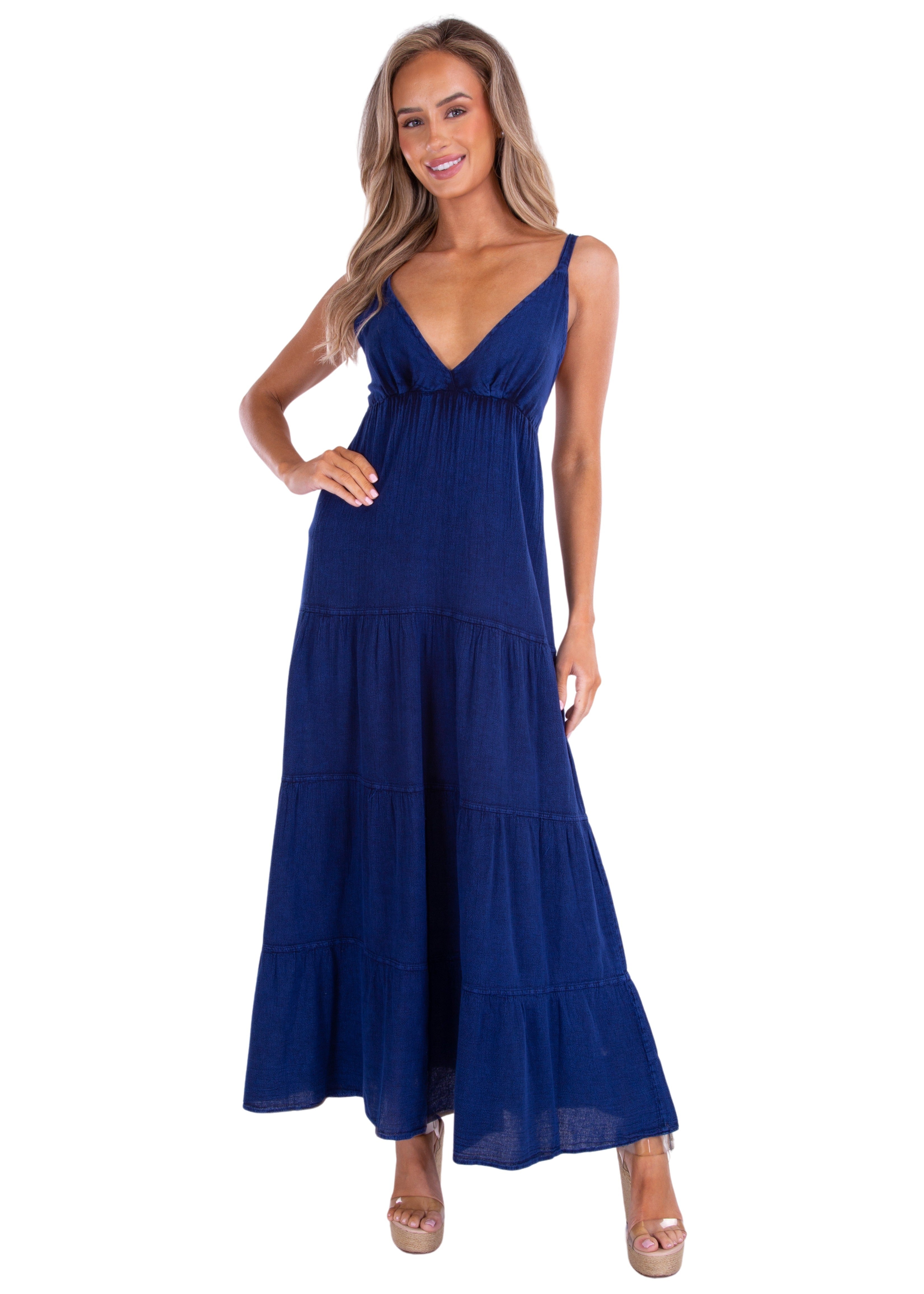 A timeless resort essential you’ll reach for again and again. This full-length cotton dress features a flattering deep V-neckline, adjustable shoulder straps, and a soft empire waist that flows into a tiered, breezy skirt. The smocked back ensures a comfortable, flexible fit, while the lightweight cotton fabric keeps you cool and free to move from the beach to dinner with ease.