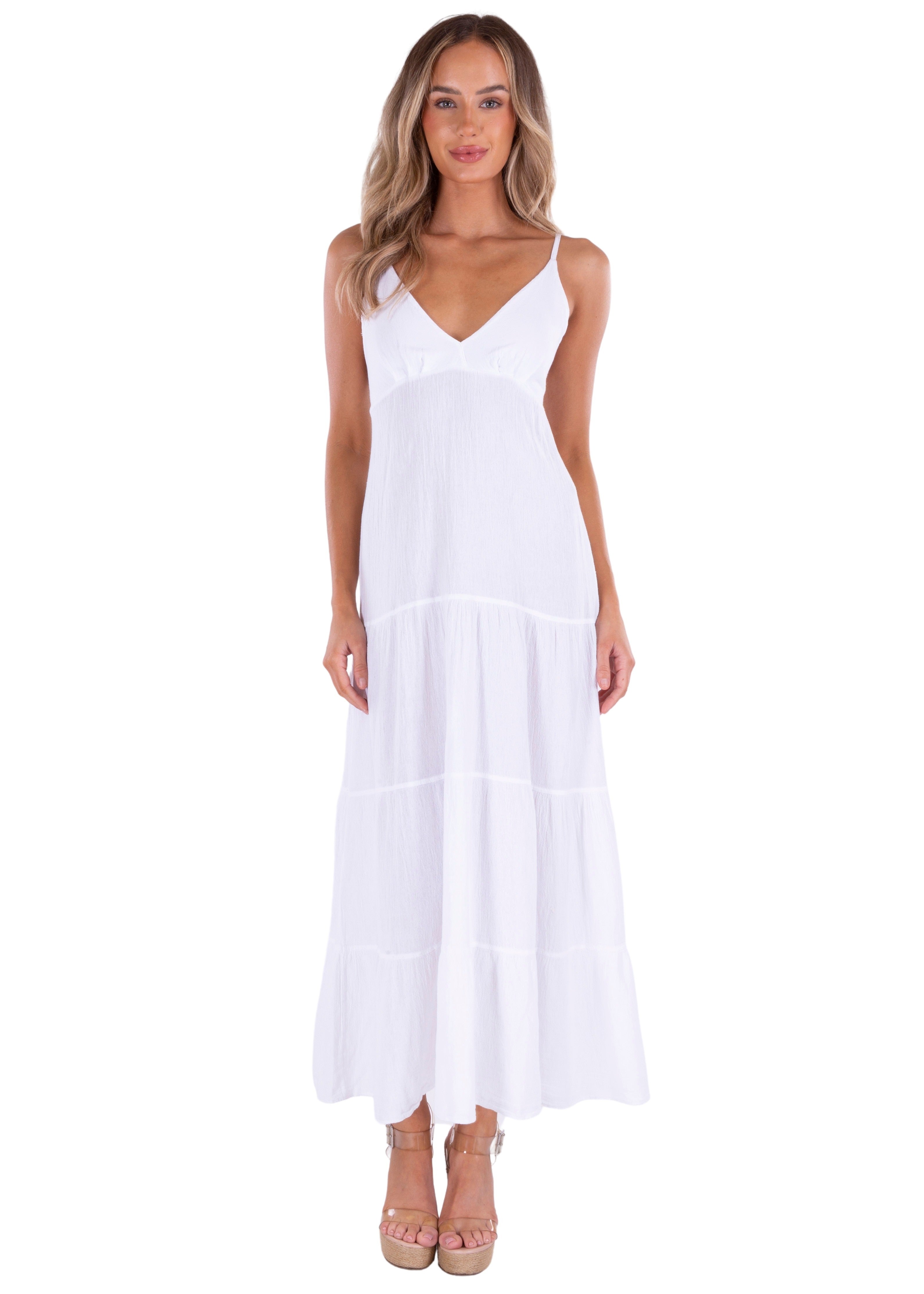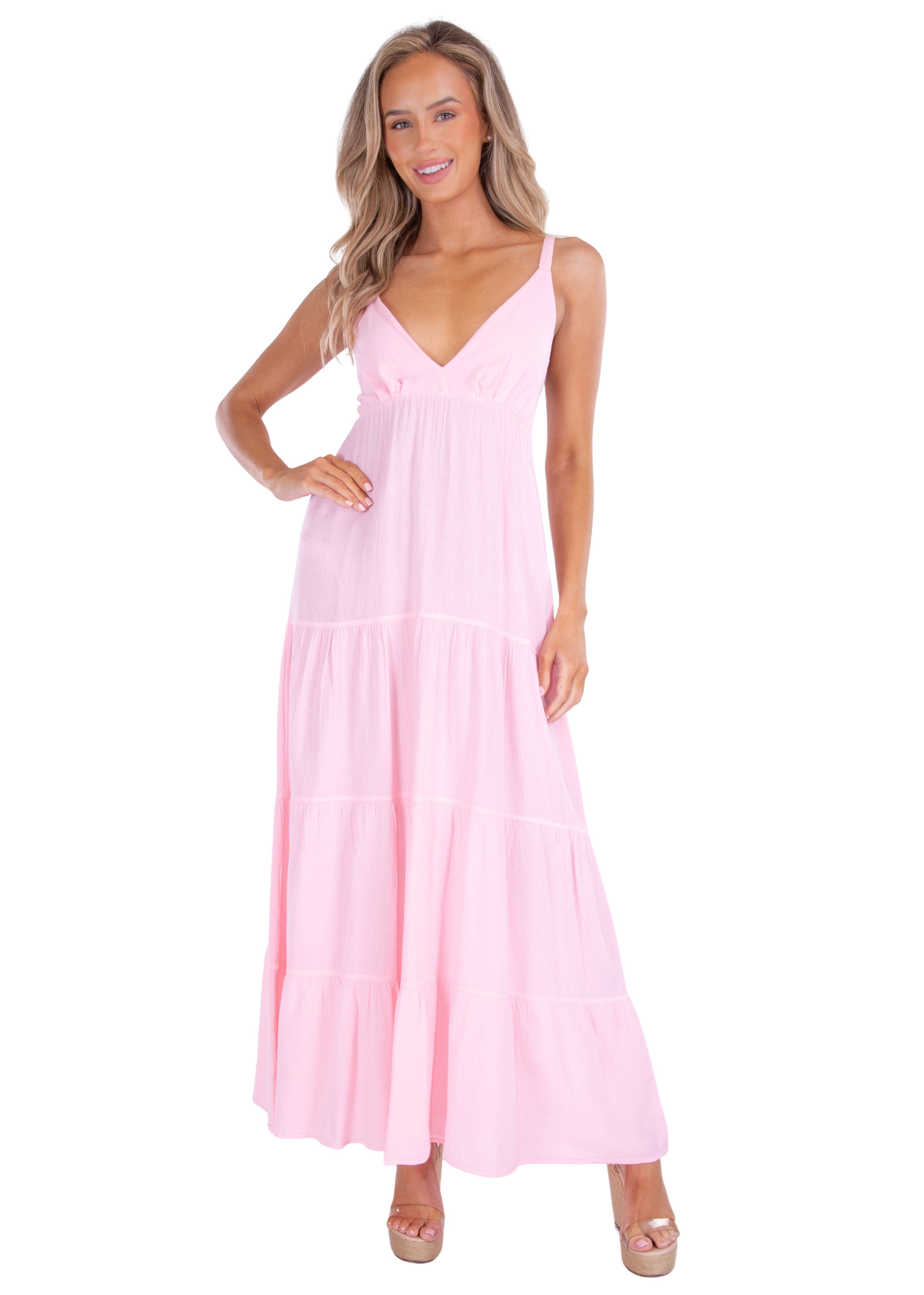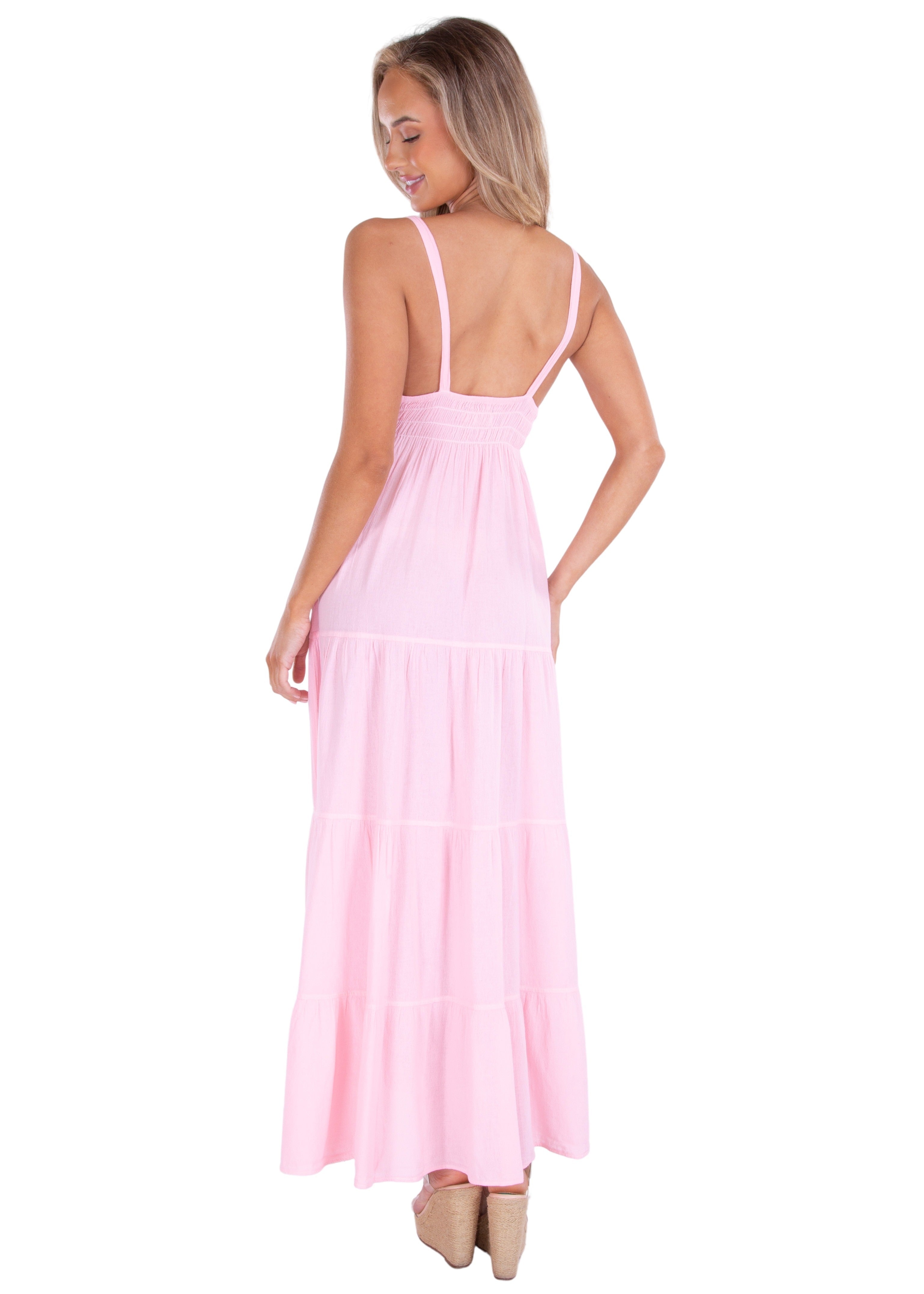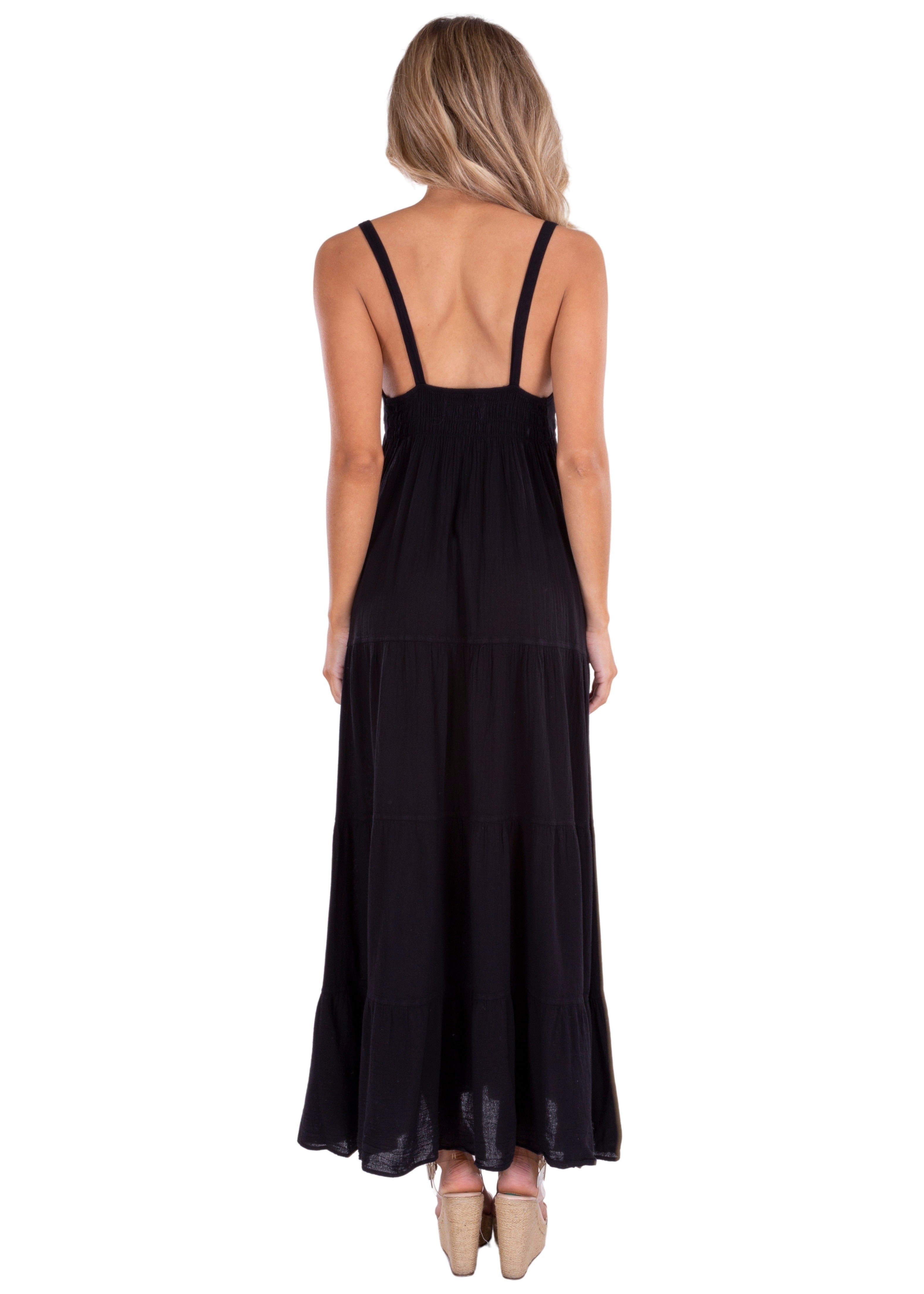 A timeless resort essential you’ll reach for again and again. This full-length cotton dress features a flattering deep V-neckline, adjustable shoulder straps, and a soft empire waist that flows into a tiered, breezy skirt. The smocked back ensures a comfortable, flexible fit, while the lightweight cotton fabric keeps you cool and free to move from the beach to dinner with ease.