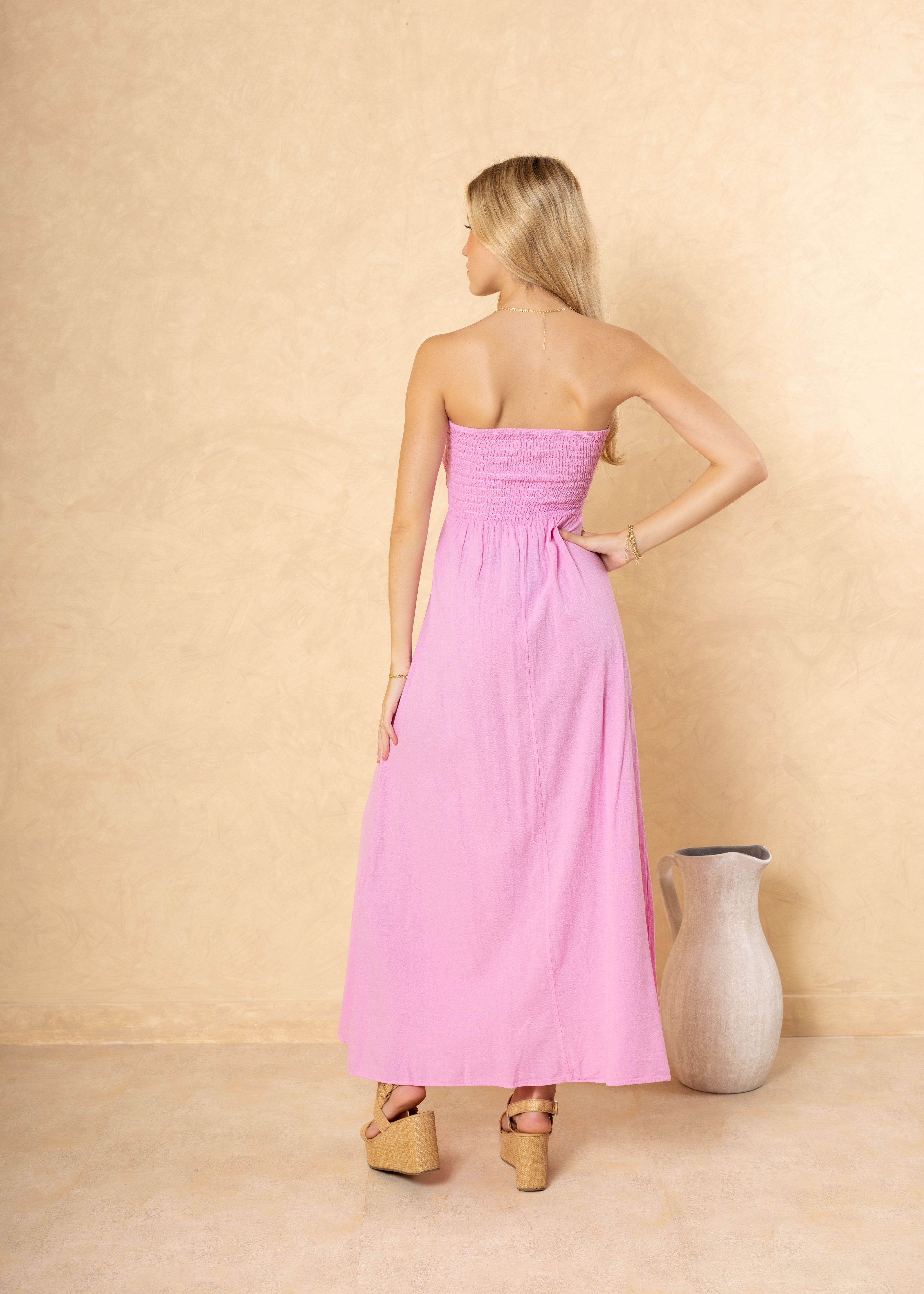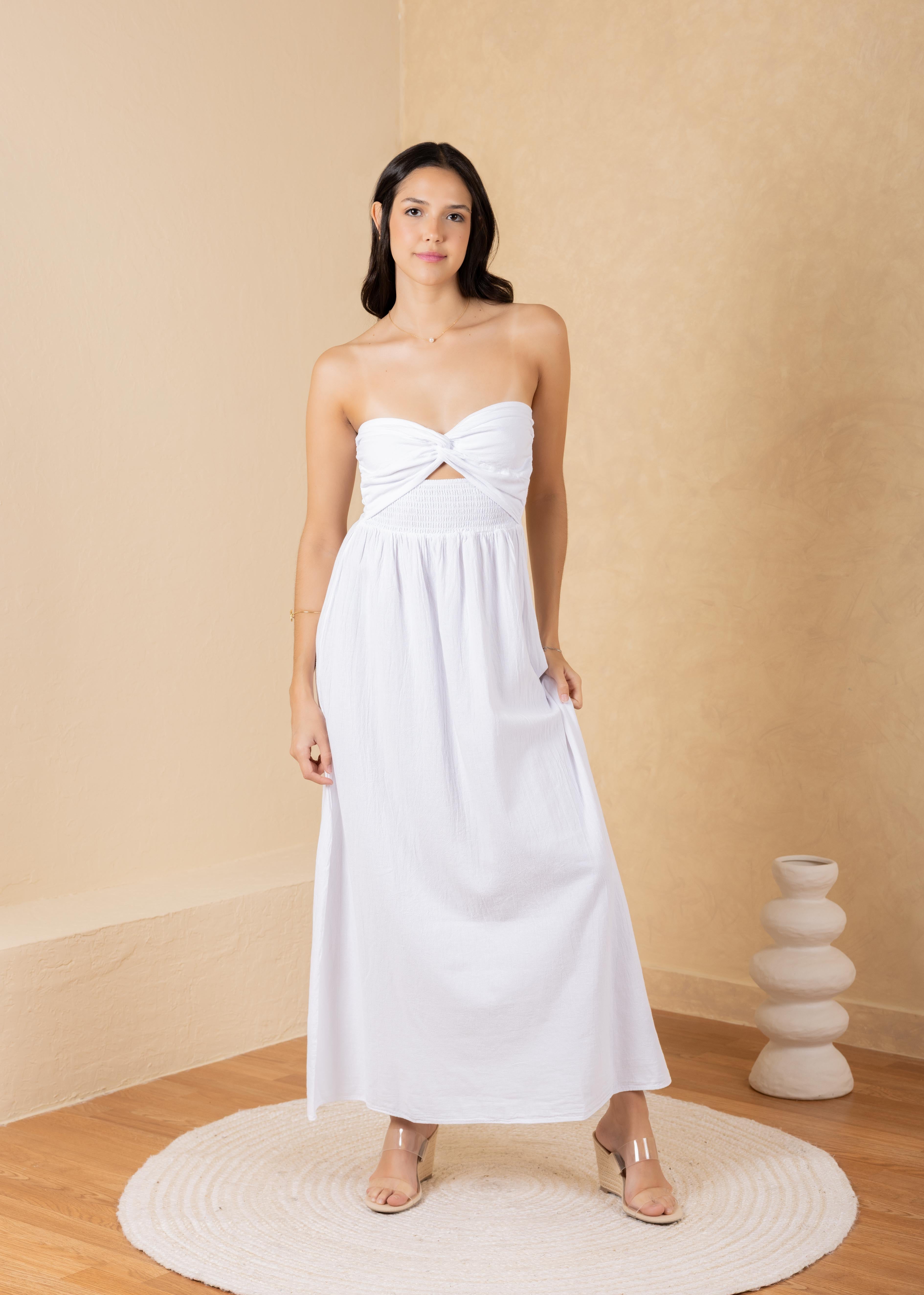 The perfect blend of effortless elegance and beachside allure. Featuring a bandeau-style bodice with a chic front twist and subtle cutout, this lightweight, strapless white maxi dress flatters the silhouette while keeping you cool in the sun. The smocked waist and back ensure a comfortable, secure fit, while the flowing skirt adds movement and grace with every step. Ideal for tropical getaways, destination weddings, and sunset dinners. Pair it with nude wedges or sandals for a head-turning vacation look.
