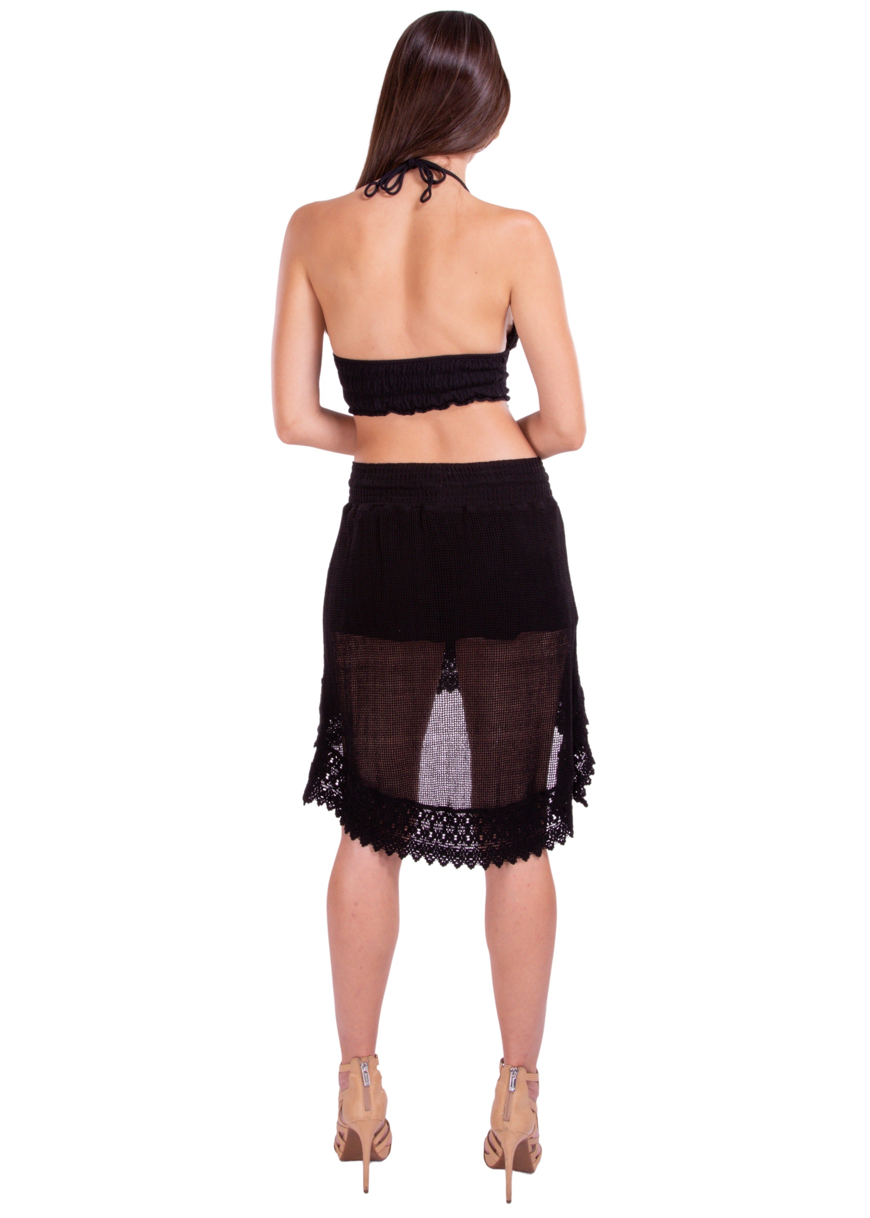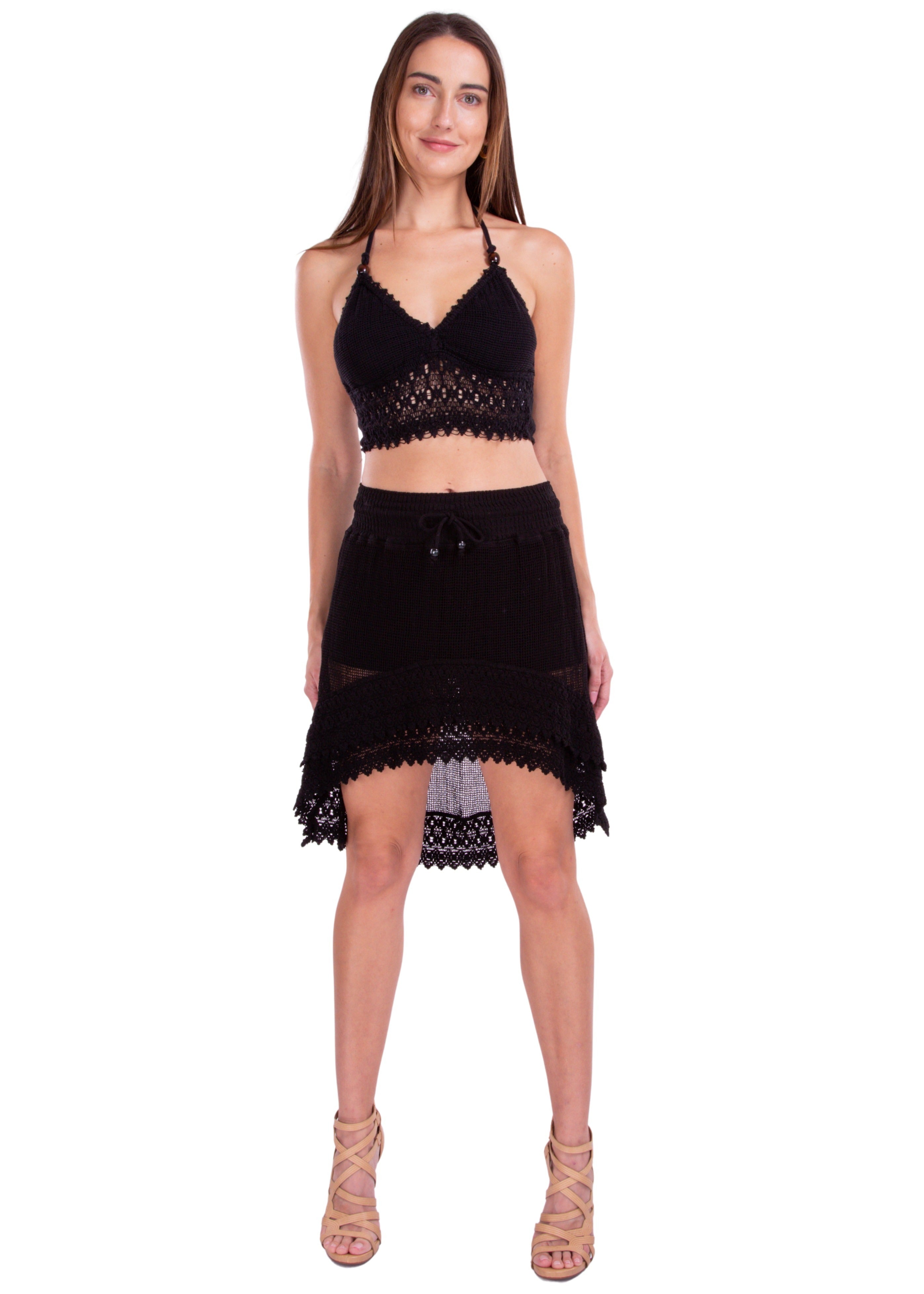 Tiered Cotton Crochet High Low Mini Skirt With Built In Shorts Shirred Drawstring Waist