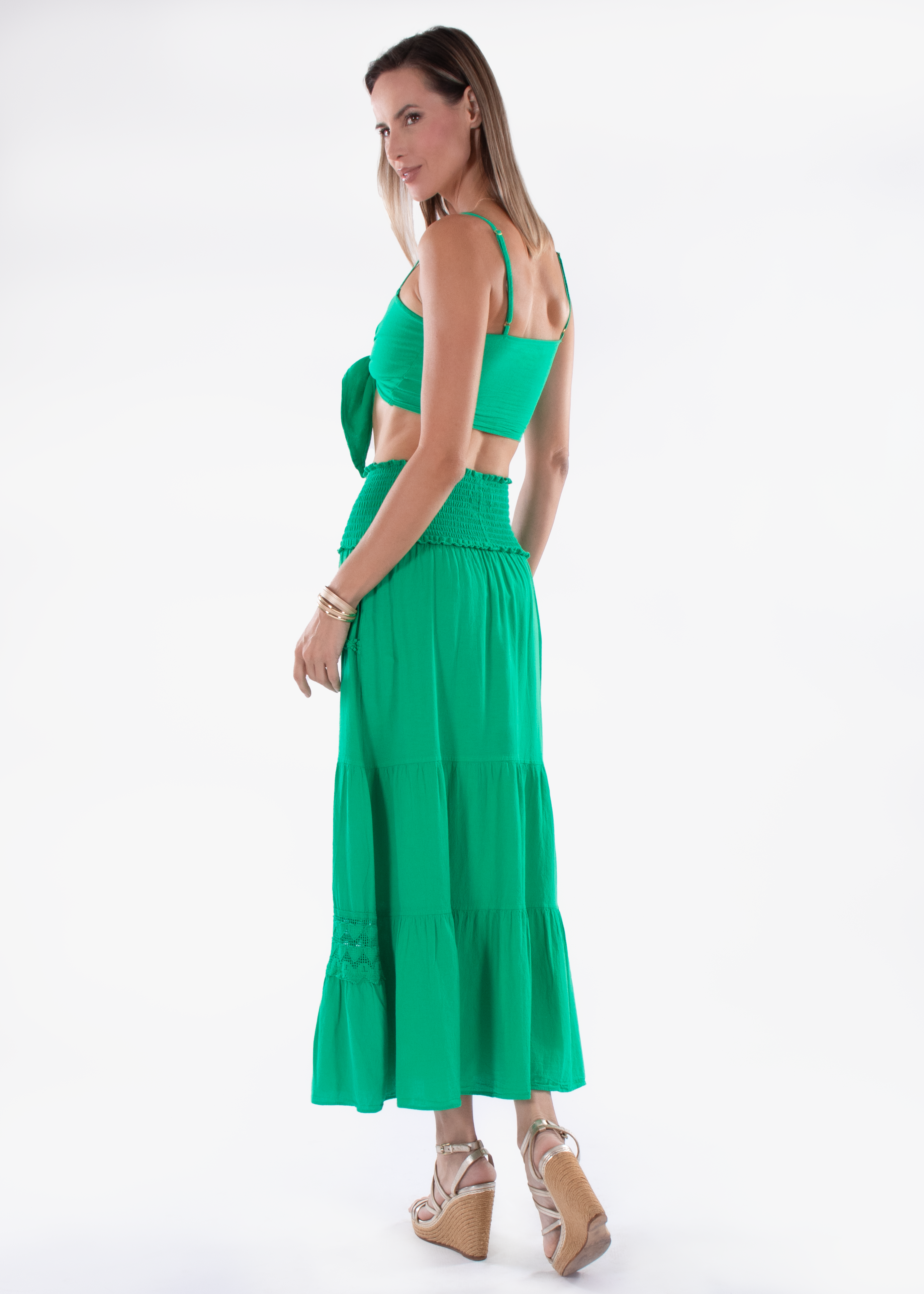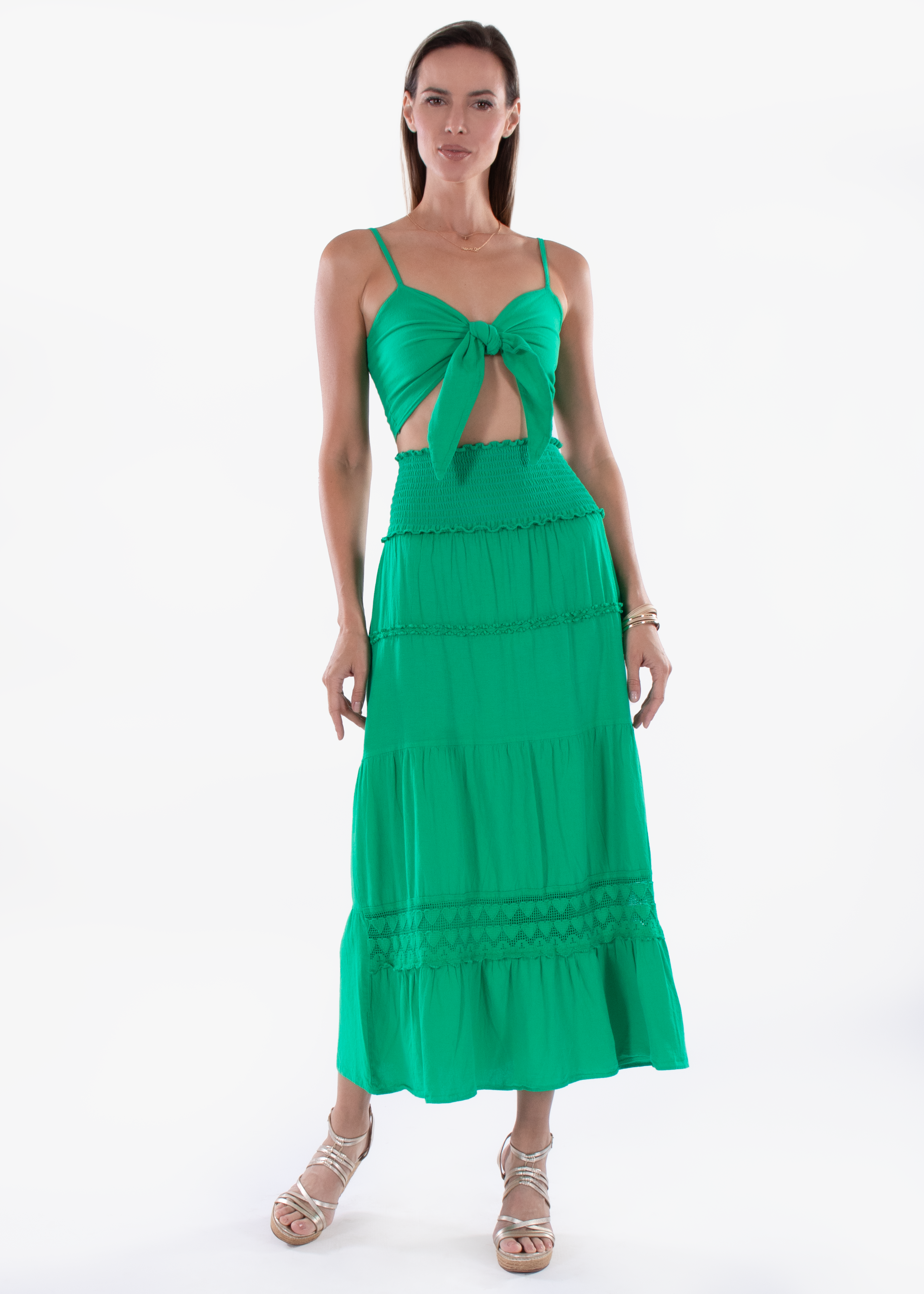 Flow into vacation mode with the 'Bailey' Maxi Skirt, a breezy, tiered silhouette designed for effortless resort style. Featuring a wide smocked waistband for a flattering fit and all-day comfort, this skirt is finished with delicate crochet trim detailing at the hem for a touch of handcrafted charm. Perfect for beachside dinners, coastal strolls, or everyday summer elegance.