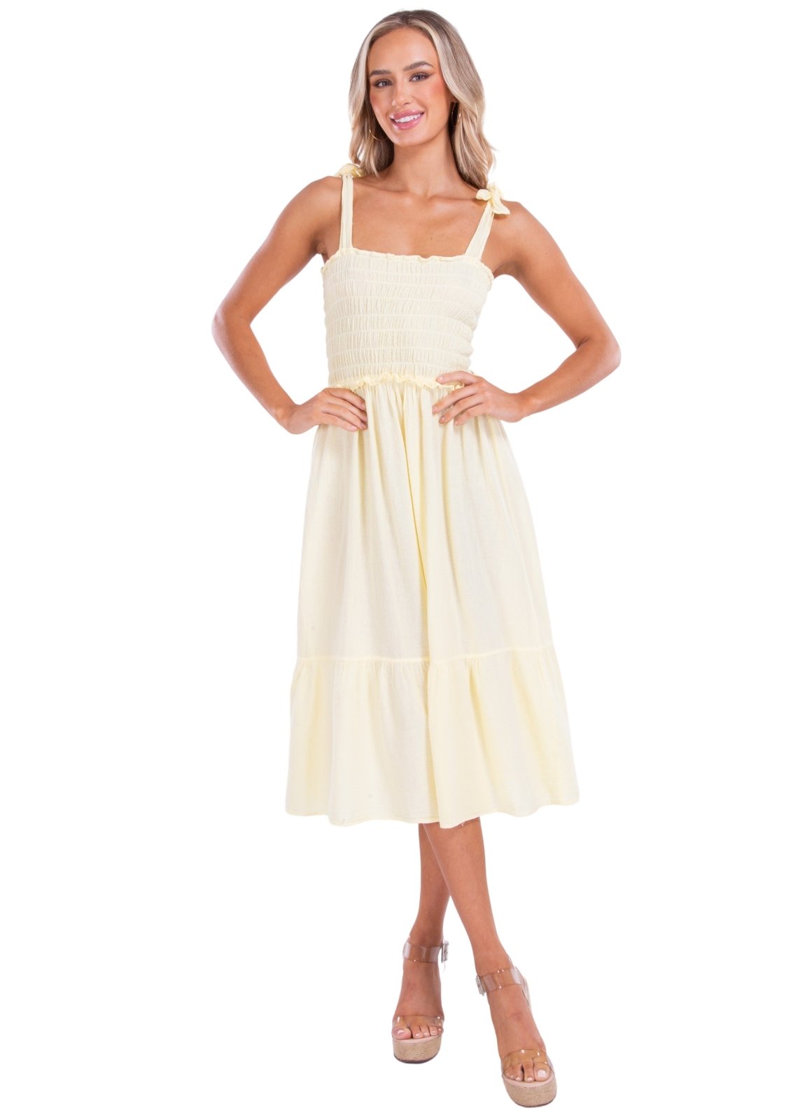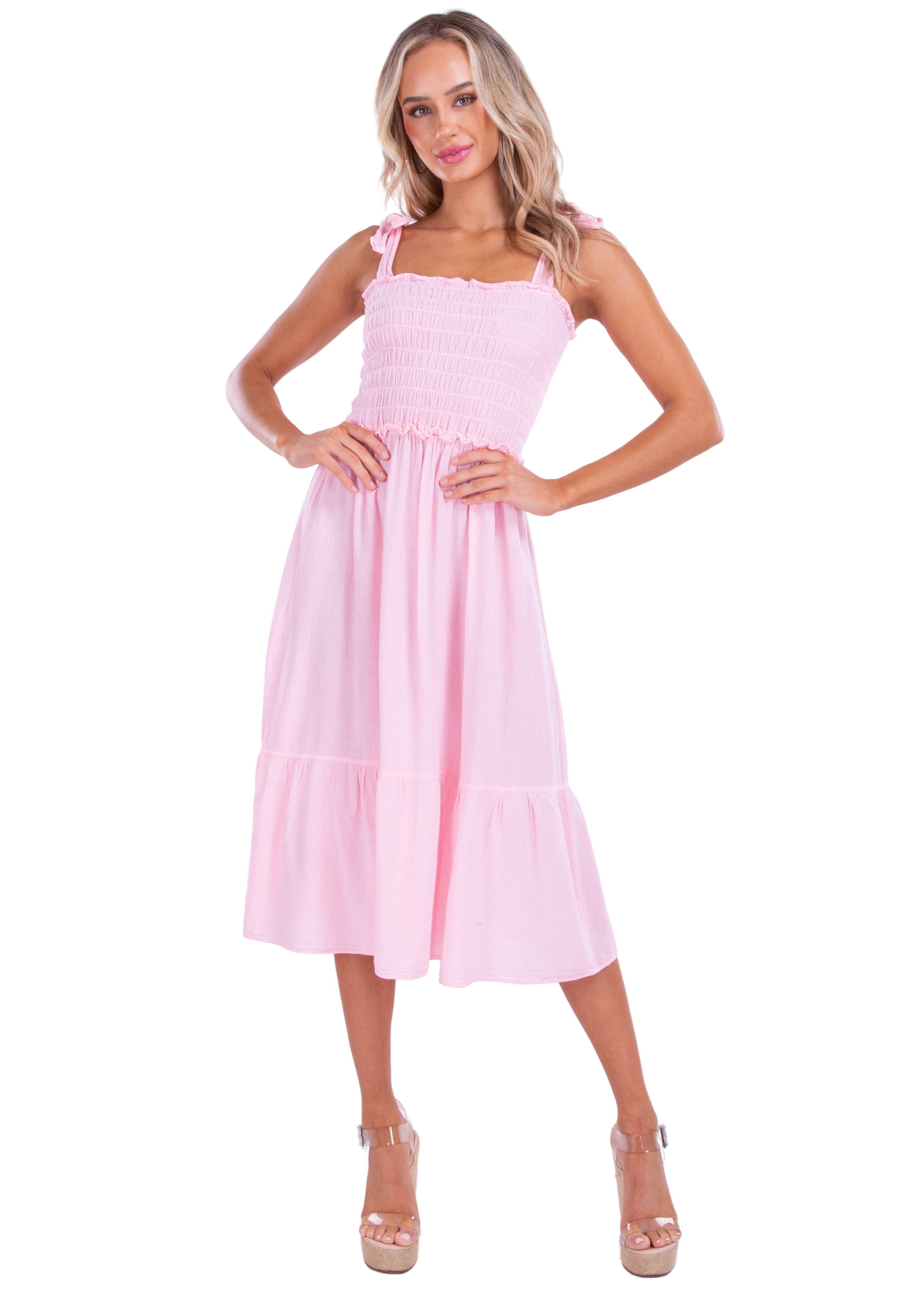 Embrace effortless charm in the ‘Fiorella’ Midi Dress, a sunshine-ready style crafted in breathable cotton with a flattering smocked bodice and flowy ruffle hem. Featuring tie-shoulder straps for an adjustable fit and a breezy midi length that moves with you, this dress is perfect for warm-weather days, weekend brunches, or coastal getaways. Style it with sandals or wedges for an instantly polished, vacation-ready look.